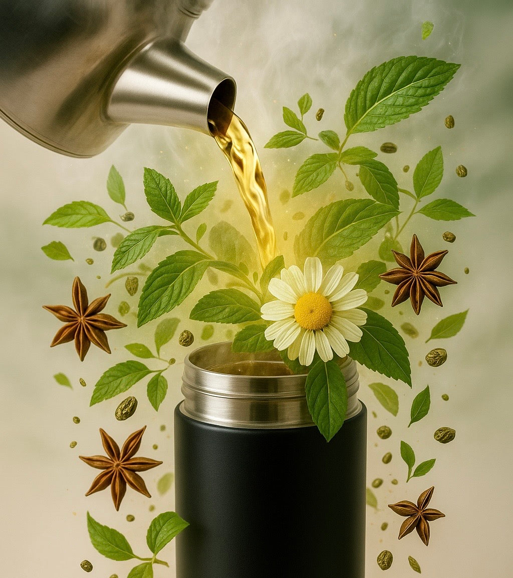 Discover our elegant mugs with built-in tea filters paired with handpicked herbal teas like chamomile, anise, mint, green tea, and sage — all crafted to elevate your everyday moments.